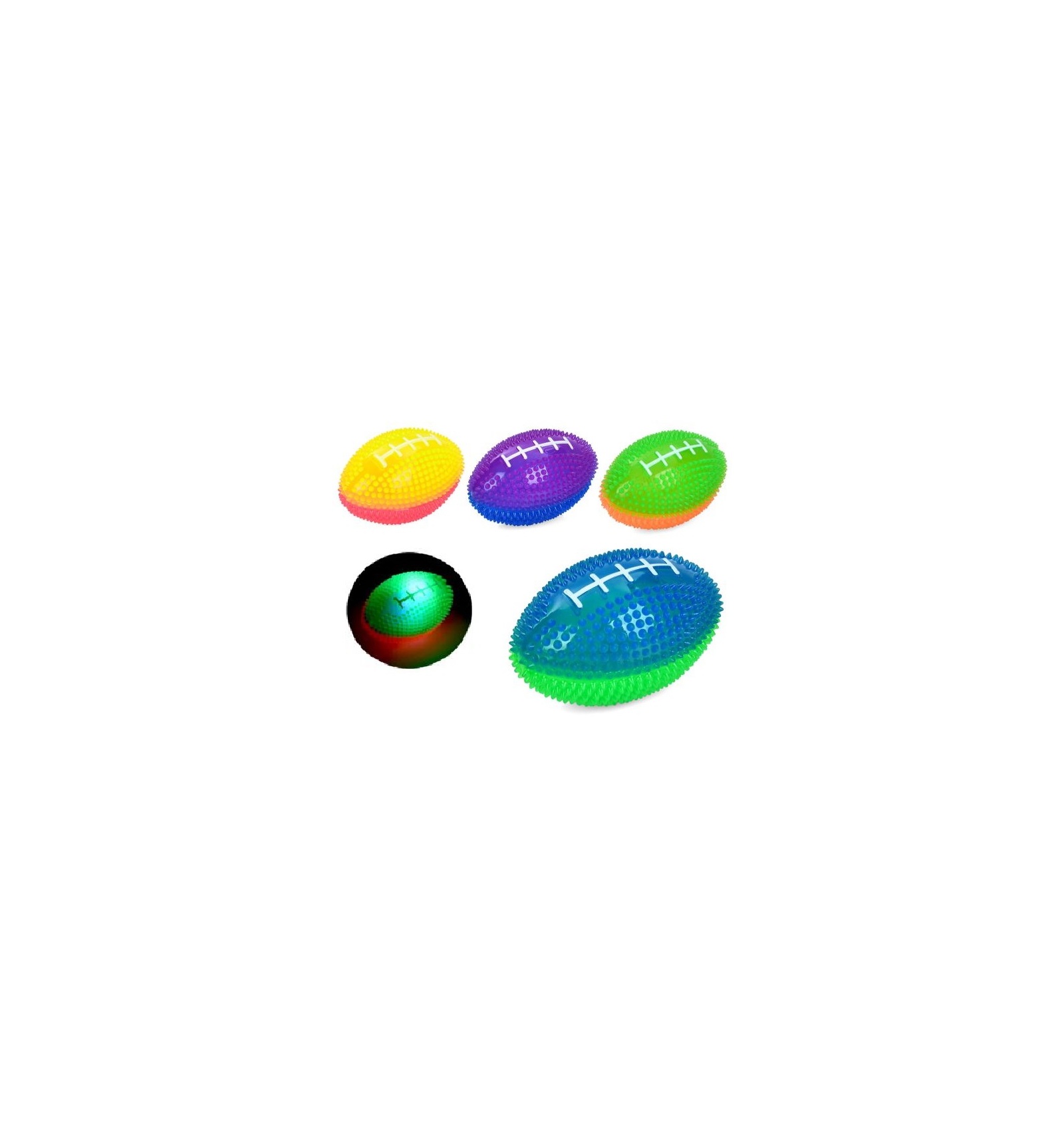 Яркий мяч в форме регби с мягкими шипами — отличная игрушка для активных игр дома и на улице. При ударе или броске мяч загорается разноцветной подсветкой, что делает игру ещё более увлекательной, особенно в вечернее время.