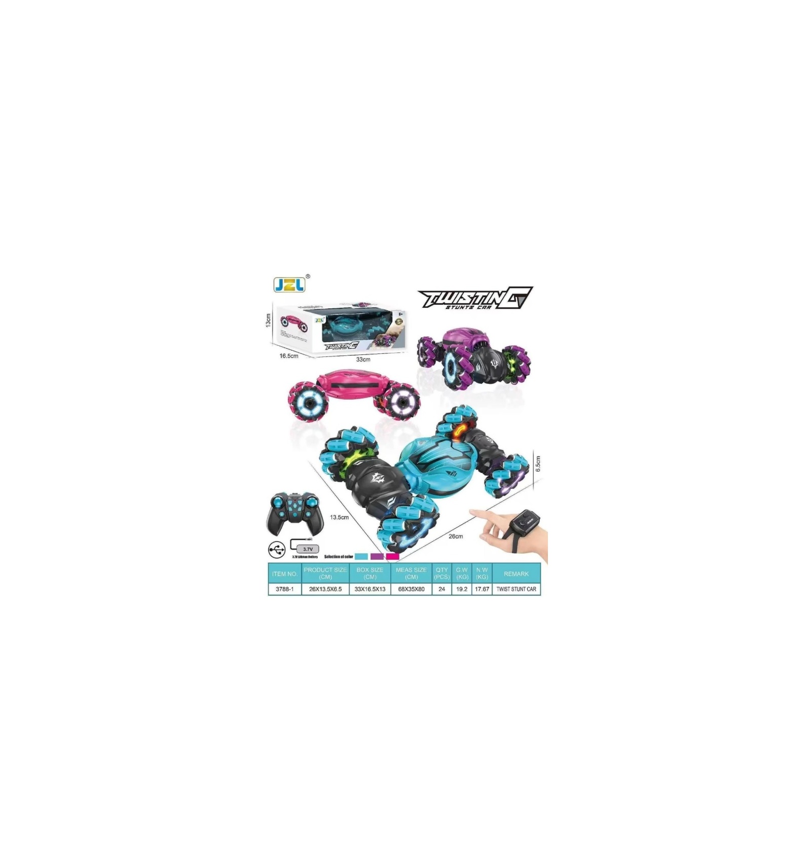 Машинка 3788-1 (12шт) трюковая, р/у, браслет, акумулятор, USB зарядка, роликовые колеса, звук, свет, в коробке, 33-16,5-13 см